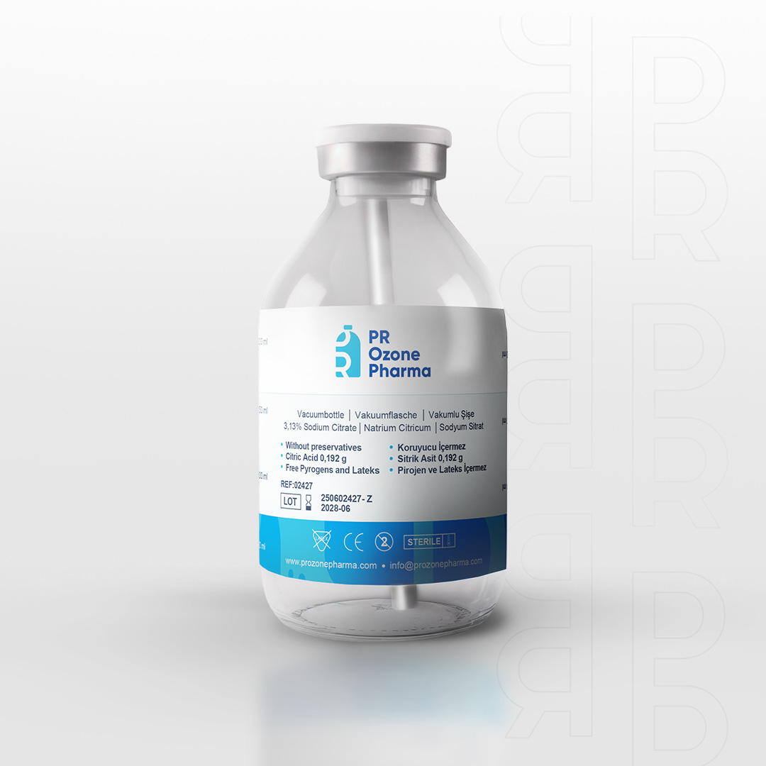 Her bir şişe 0,192 gram sitrik asit içerir ve %3,13 oranında sodyum sitrat içeriğiyle ozon tedavilerinde optimum performans sunar. Ayrıca şişelerimiz Pirojen ve Lateks içermez, böylece alerjik reaksiyon riski en aza indirilmiştir.