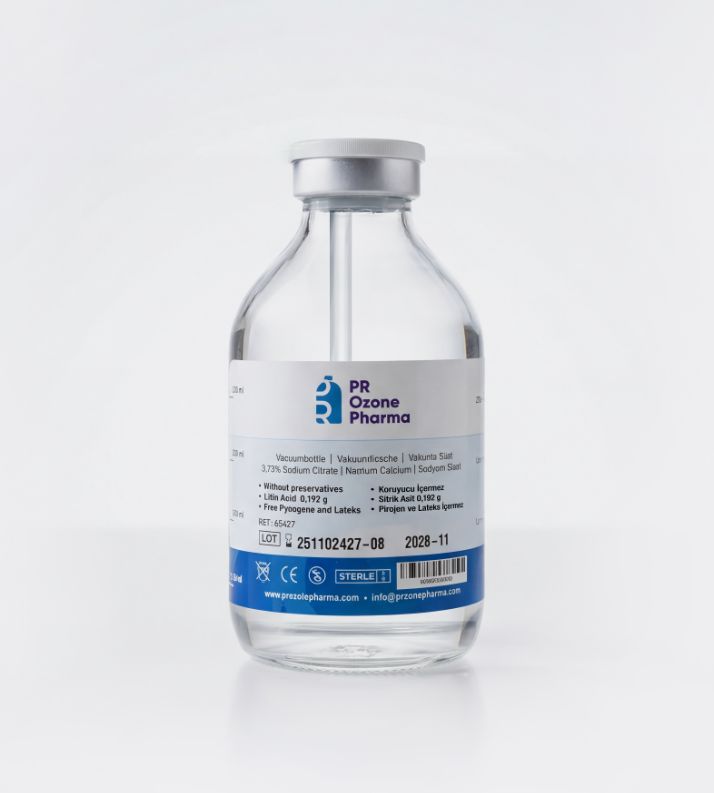 Sitratlı vakumlu infüzyon şişesi, yüksek standartlarda üretilmiş olup ozon tedavilerinde maksimum performans ve güvenilirlik sağlamak amacıyla özel olarak tasarlanmıştır.
